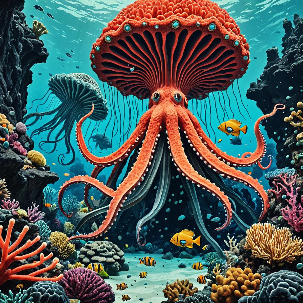 Fantasy underwater scene featuring colorful coral reef guardians battling a giant cartoon-style squid. The artwork showcases vibrant coral formations, diverse reef fish, and an imaginative giant squid with a large, textured cap and multiple waving tentacles in a playful, modern cartoon style.
