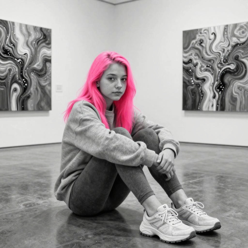 Realistic photo.Inside a modern art gallery. Create an artistic full-length, full-body oil portrait of a teenager age 17 in contemporary style. The image is monochrome except for her neon pink hair, wearing an oversized gray sweatshirt and leggings, sitting on the floor with arms wrapped around her knees, and sporting chunky sneakers. Flowing paint characterizes the work, highly detailed, very high quality. realistic photo