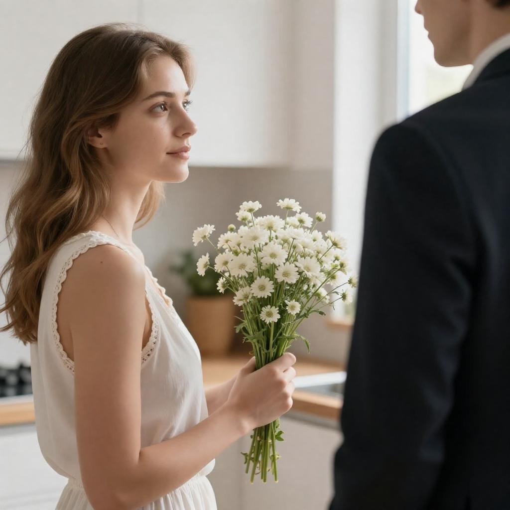 Photograph of a woman with light brown hair in a white lace-trimmed sleeveless top, holding a small bouquet of white wildflowers. She is standing beside a man in a dark suit. Soft, natural light from the right. Background includes blurred kitchen elements. Woman's profile shows a neutral expression. Man's face is not visible. Woman's right side is facing the camera.