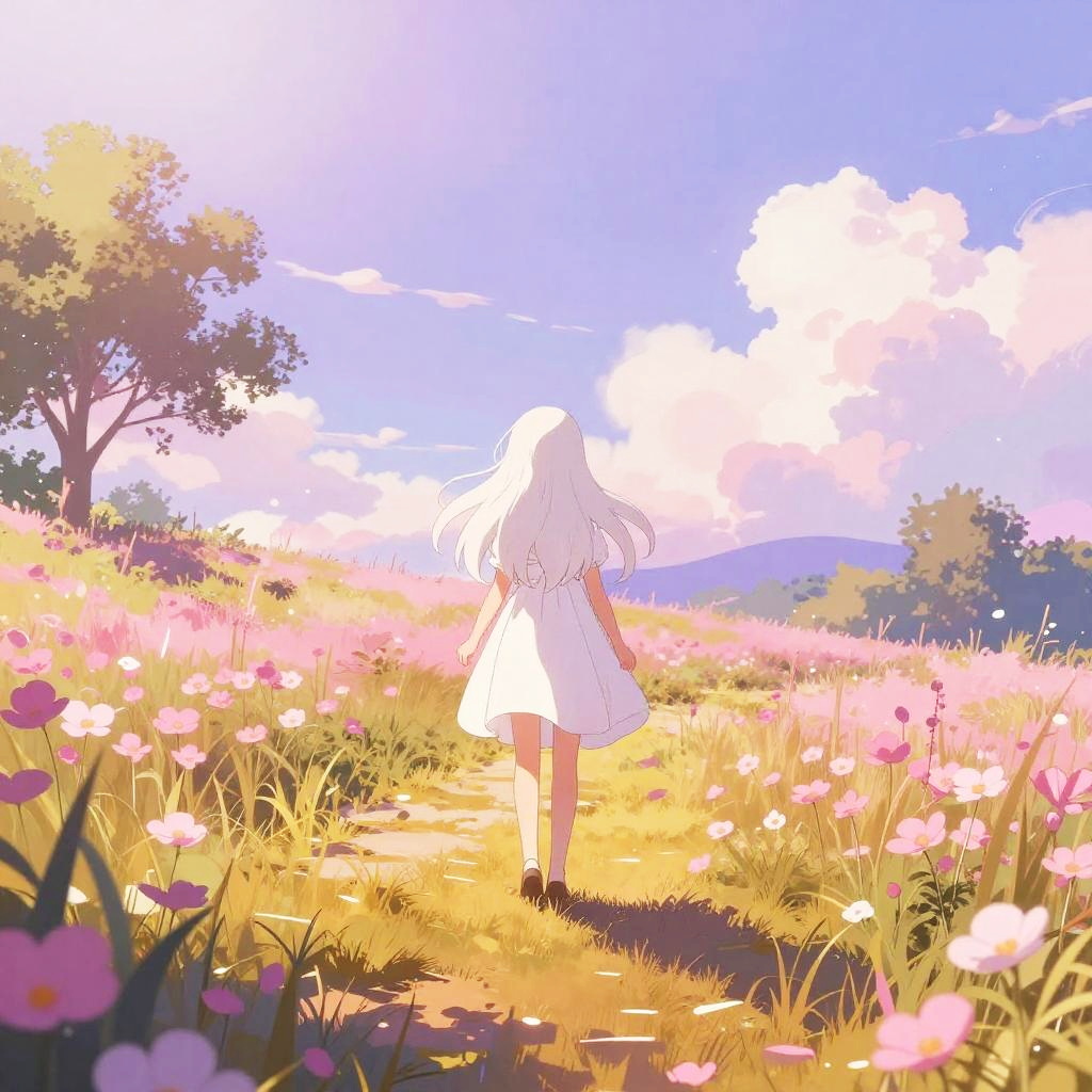 Digital anime-style drawing of a young girl with long white hair, wearing a white dress, standing on a golden path in a vibrant meadow. She's facing away, towards a bright, sunlit sky with purple and pink clouds. Pink flowers and tall grass surround the path, while a tree stands to the left. The scene is colorful and ethereal.