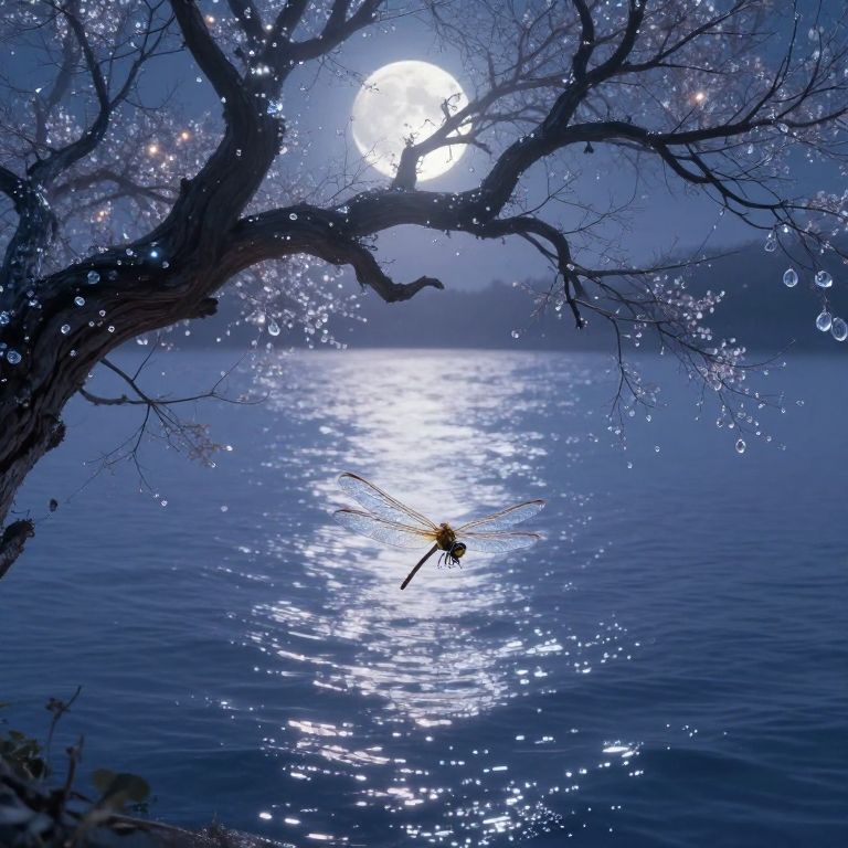 A captivating, dreamlike landscape bathed in soft moonlight shimmers with an enchanting iridescence, as if observed from the aerial viewpoint of a dragonfly skimming above a shimmering body of water. This surreal scene evokes a sense of both enchantment and melancholy, reminiscent of the dreamy, hyper-realistic techniques employed by surrealist artists. An ancient tree stretches towards the heavens, its twisted branches adorned with gleaming crystals and minuscule lights that seem to pirouette in the gentle zephyr. The atmosphere is one of wonder intermingled with a touch of sorrow, as if this moment of magic has been suspended in time amidst an ever-changing world below.