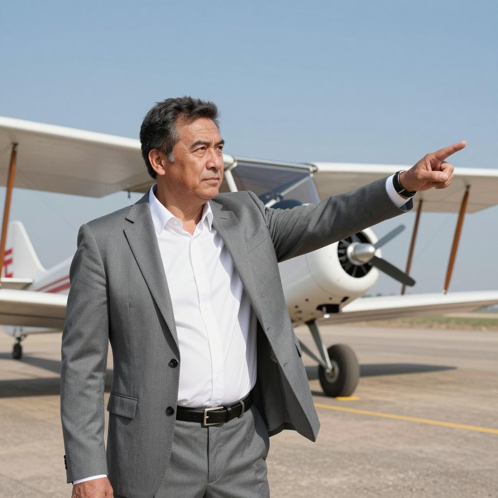 Middle-aged man in a gray suit and white shirt, with short dark hair, extending right arm forward, pointing at a small biplane with wings extended, landing on a dirt runway. Clear blue sky, barren landscape in background. Man's face intense, determined expression. One person.