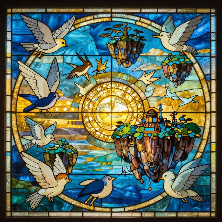 Vibrant stained glass artwork depicting white and blue birds flying around floating flower-filled islands, centered around a glowing sunburst.