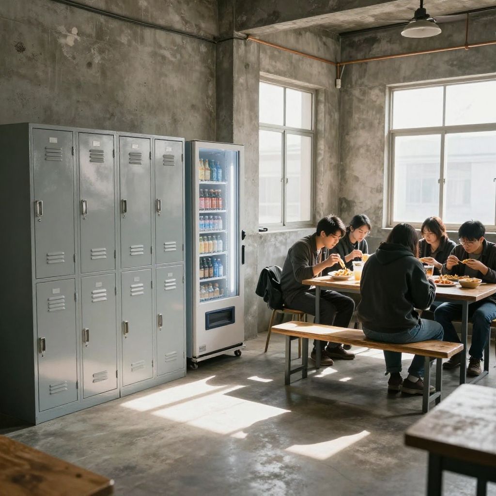 Cozy factory break room with metal lockers, vending machines, worn-out benches, industrial concrete walls, workers eating lunch, morning sunlight streaming through windows, photorealistic