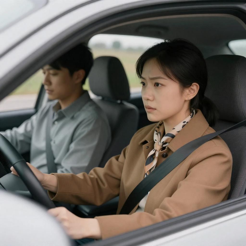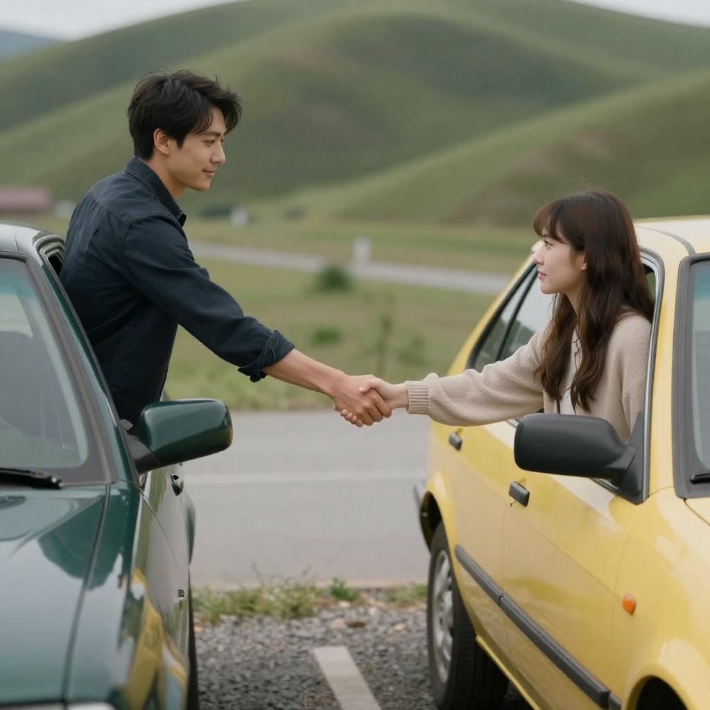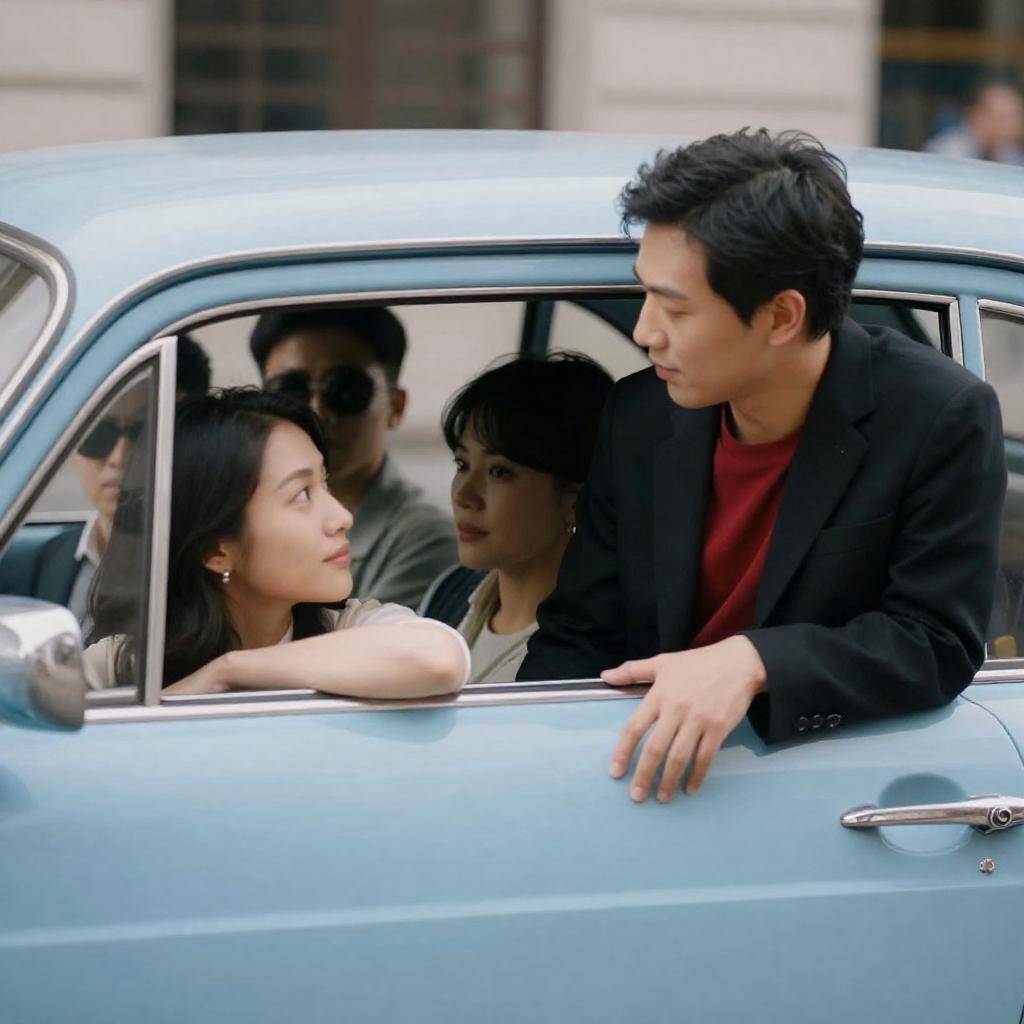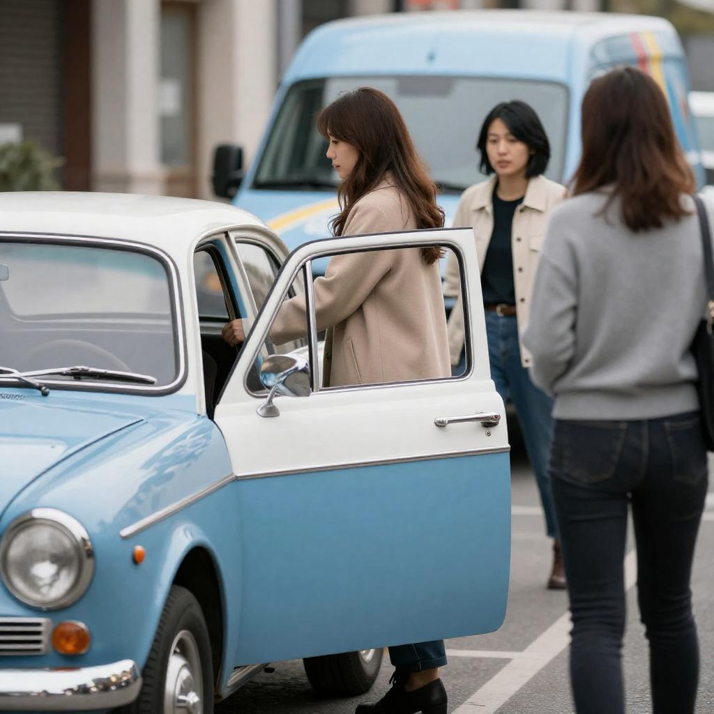 Photograph of three women standing beside a vintage blue and white car with an open driver's door. One woman with long brown hair in a beige coat reaches into the car. Another woman with short black hair in a beige jacket walks away. A third woman with medium brown hair in a gray sweater faces away. A blue van with colorful graphics is in the background. Urban street setting.
