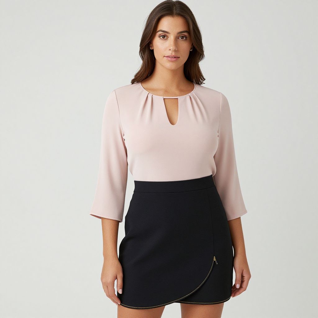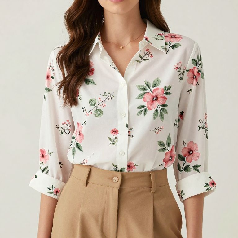 Portrait of a smiling young woman with wavy chestnut hair wearing a light pink button-up shirt with rolled sleeves and beige tailored trousers. She is posed against a subtle stone-textured neutral background, showcasing a casual chic outfit.
