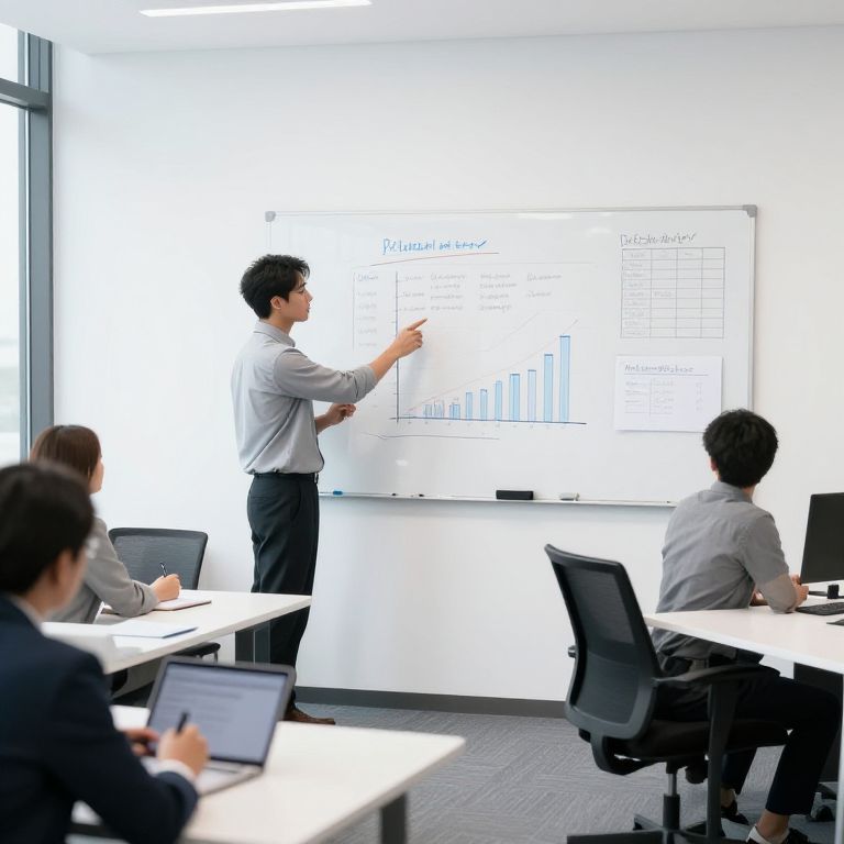 A sleek business office with whiteboards displaying data charts and meeting agendas. A manager is standing by a whiteboard, gesturing towards key points while colleagues take notes on their tablets, surrounded by ergonomic workstations.