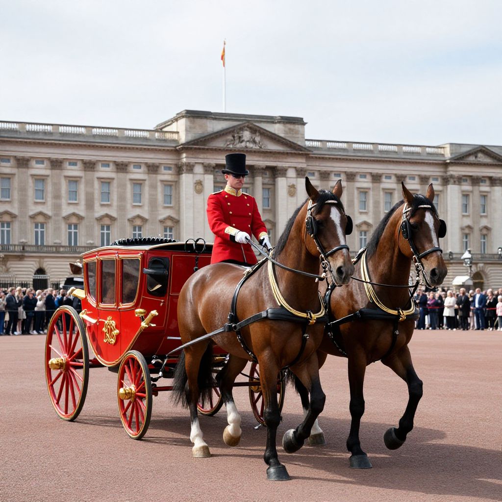 Two majestic brown horses pull a regal red carriage adorned with gold accents, driven by a man in a crimson uniform and black top hat, set against the backdrop of Buckingham Palace and a crowd of spectators.