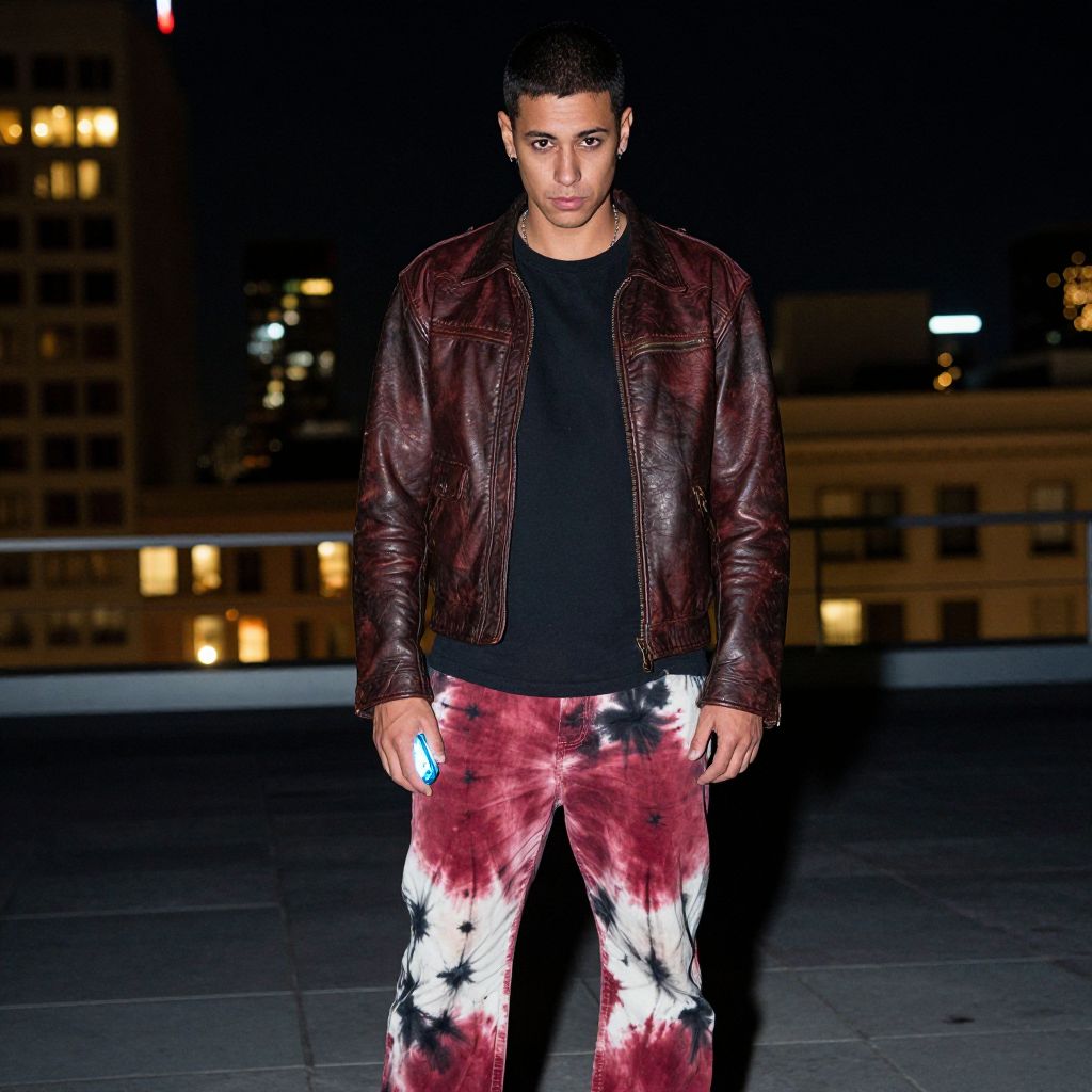 A modern urban street style shot of a man with sharp cheekbones, dark eyes, and short black hair stands in front of a city rooftop with night lights, wearing stylish and slightly oversized tie-dye pants in deep red, white, and black, paired with a vintage leather jacket and a glowing smartphone in hand.