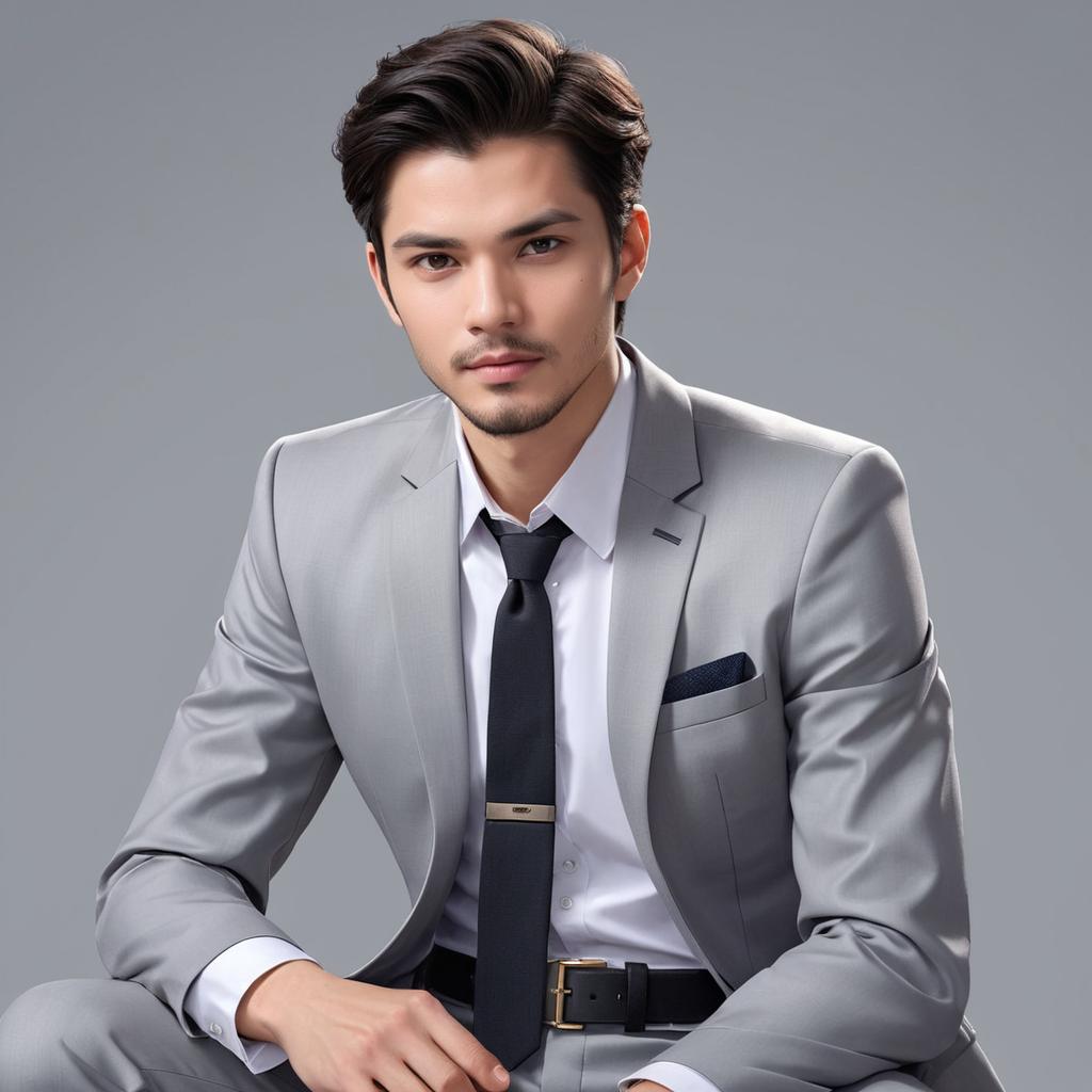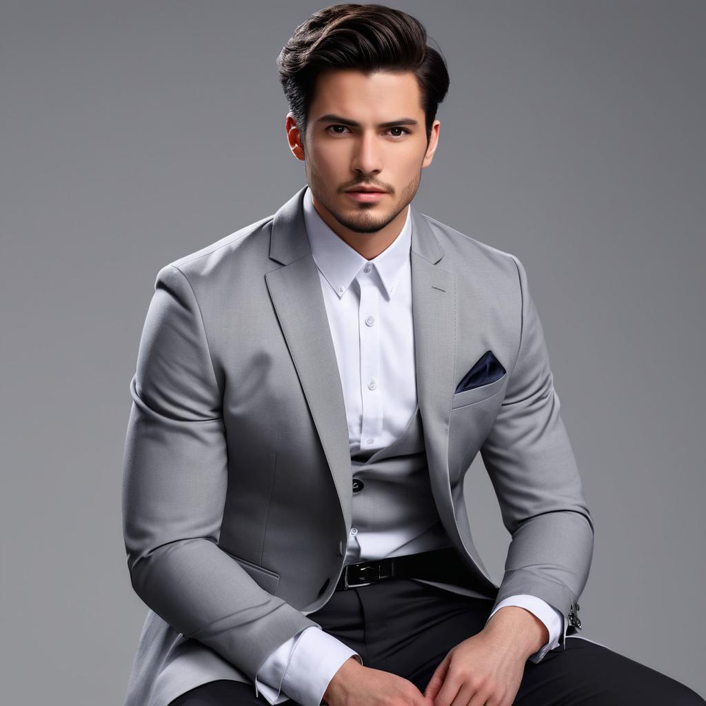 Portrait of a confident young man with dark hair wearing a light gray suit with a black tie, white shirt, and black pocket square. He is sitting with a serious expression against a plain gray background, dressed in smart formal attire with a modern wristwatch.