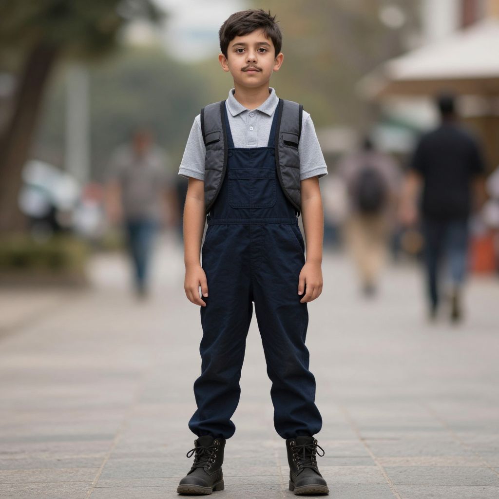 Photograph of a young boy with short black hair, wearing a white shirt, black overalls, and boots, standing confidently on a blurred urban street