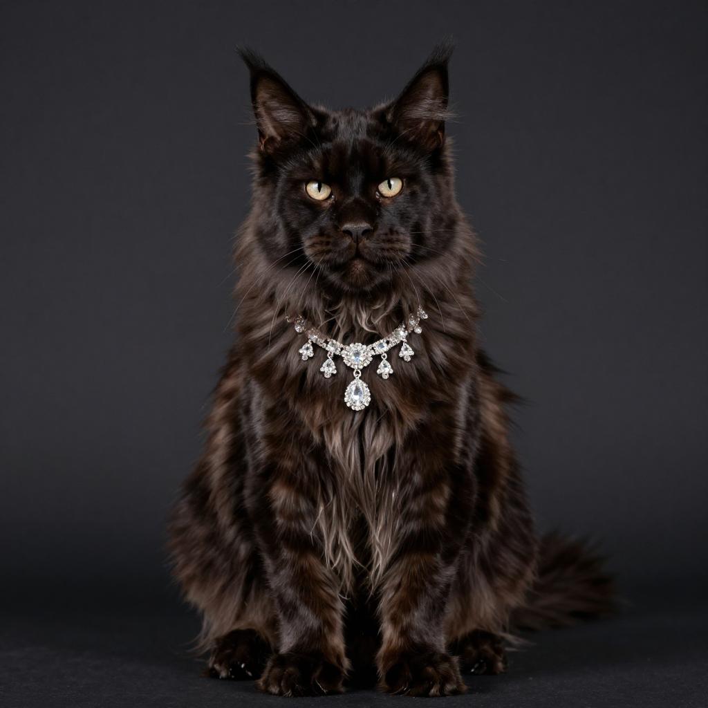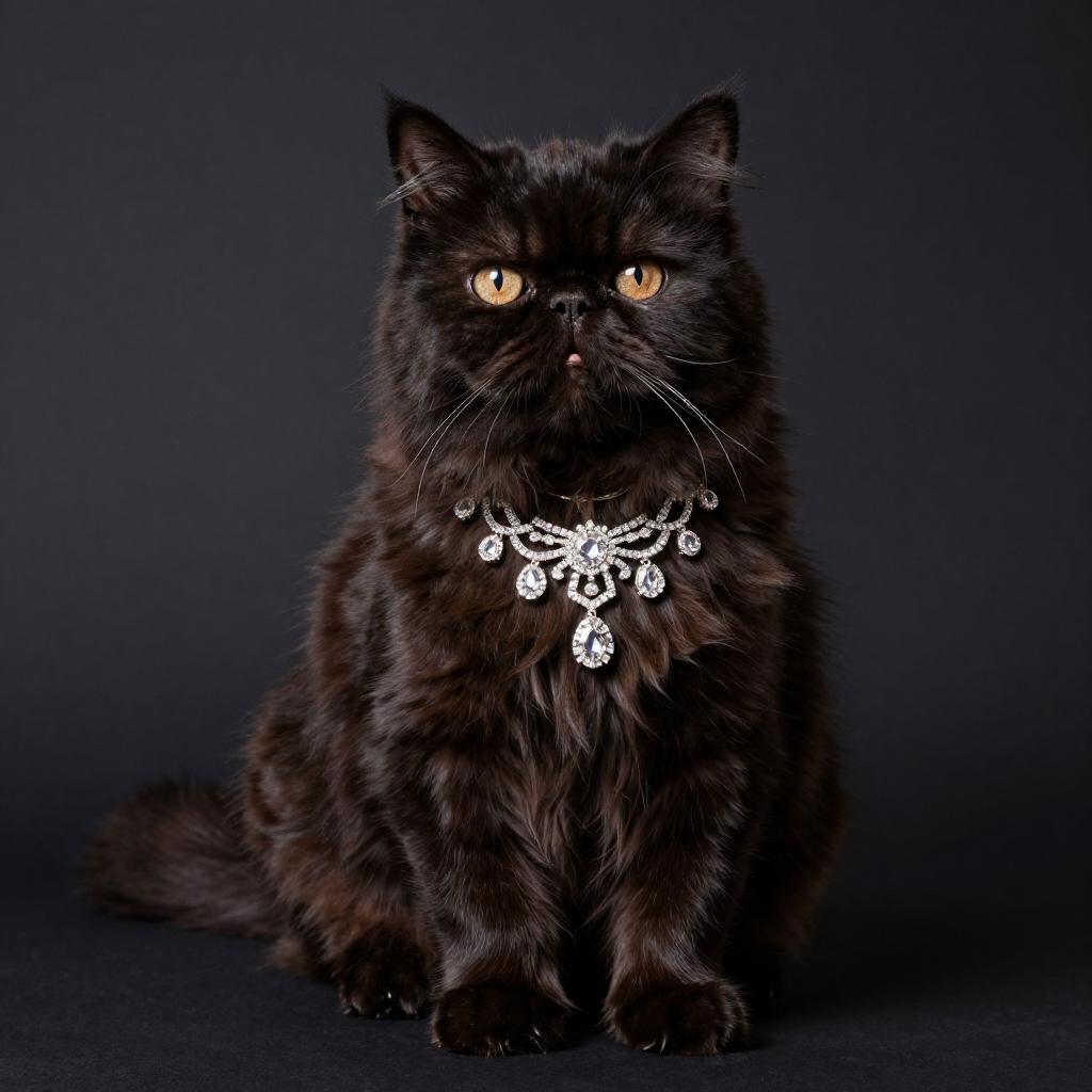 Luxurious studio portrait of a Abyssinian cat sitting upright, glossy dark fur, wearing an ornate sparkling diamond necklace, clean dark background with spotliht, high-end fashion pet photography, high resolution, ultra-detailed