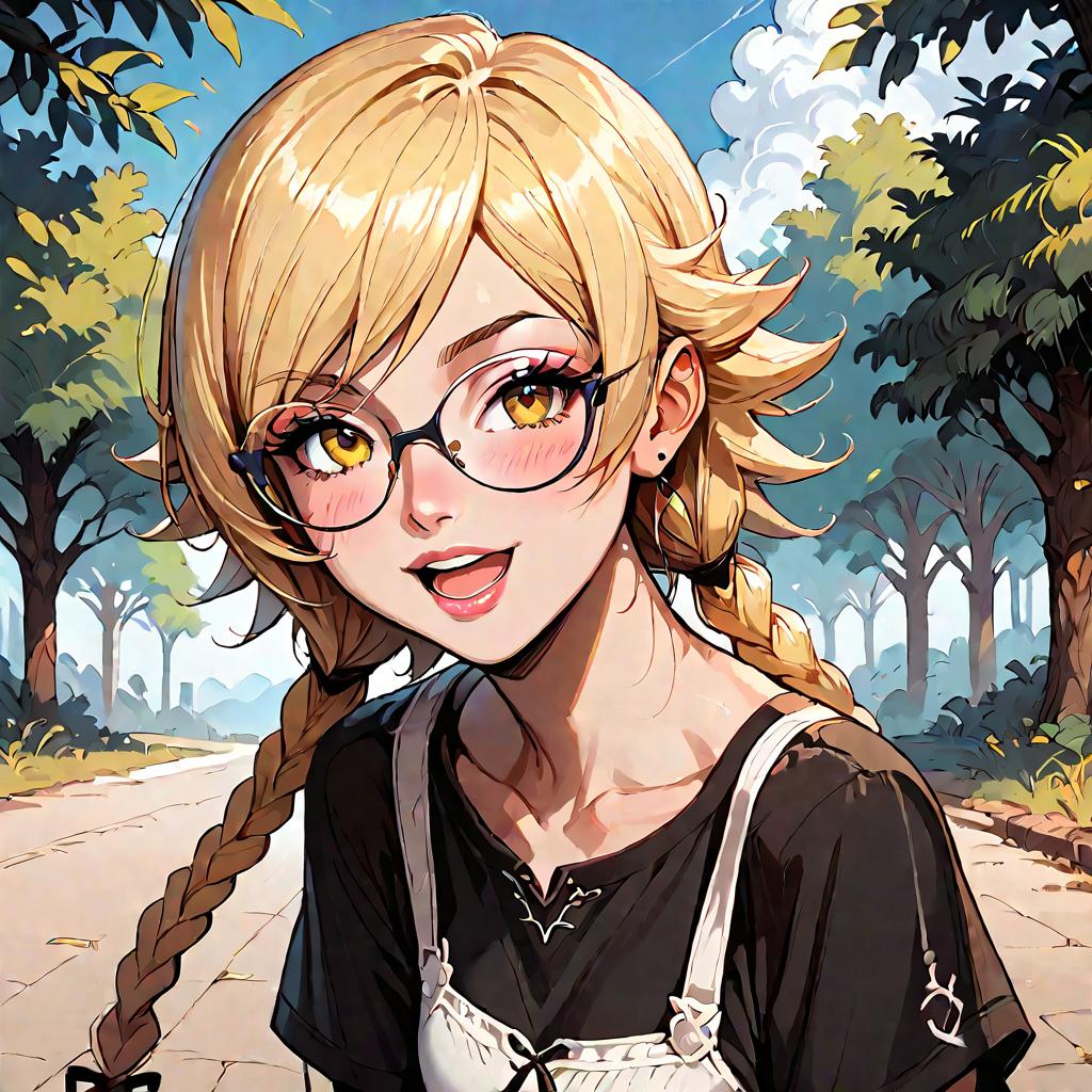 Digital anime-style portrait of a blonde elf girl with glasses, golden eyes, braided hair, black vest, and white shirt, smiling against a colorful