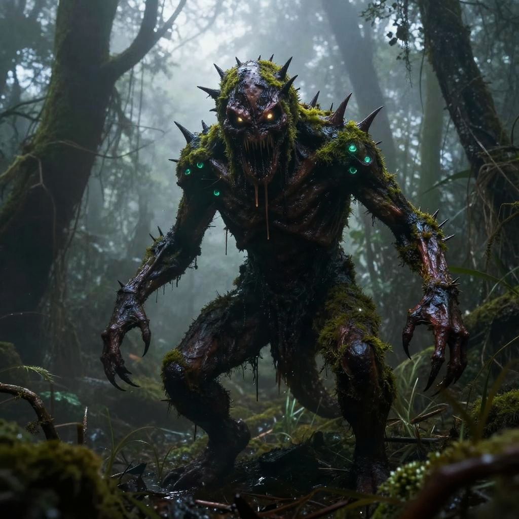 Scary monster body lurking in a dense swamp, covered in slimy moss and spikes, glowing bioluminescent patches on its skin, eerie glowing eyes piercing through thick fog