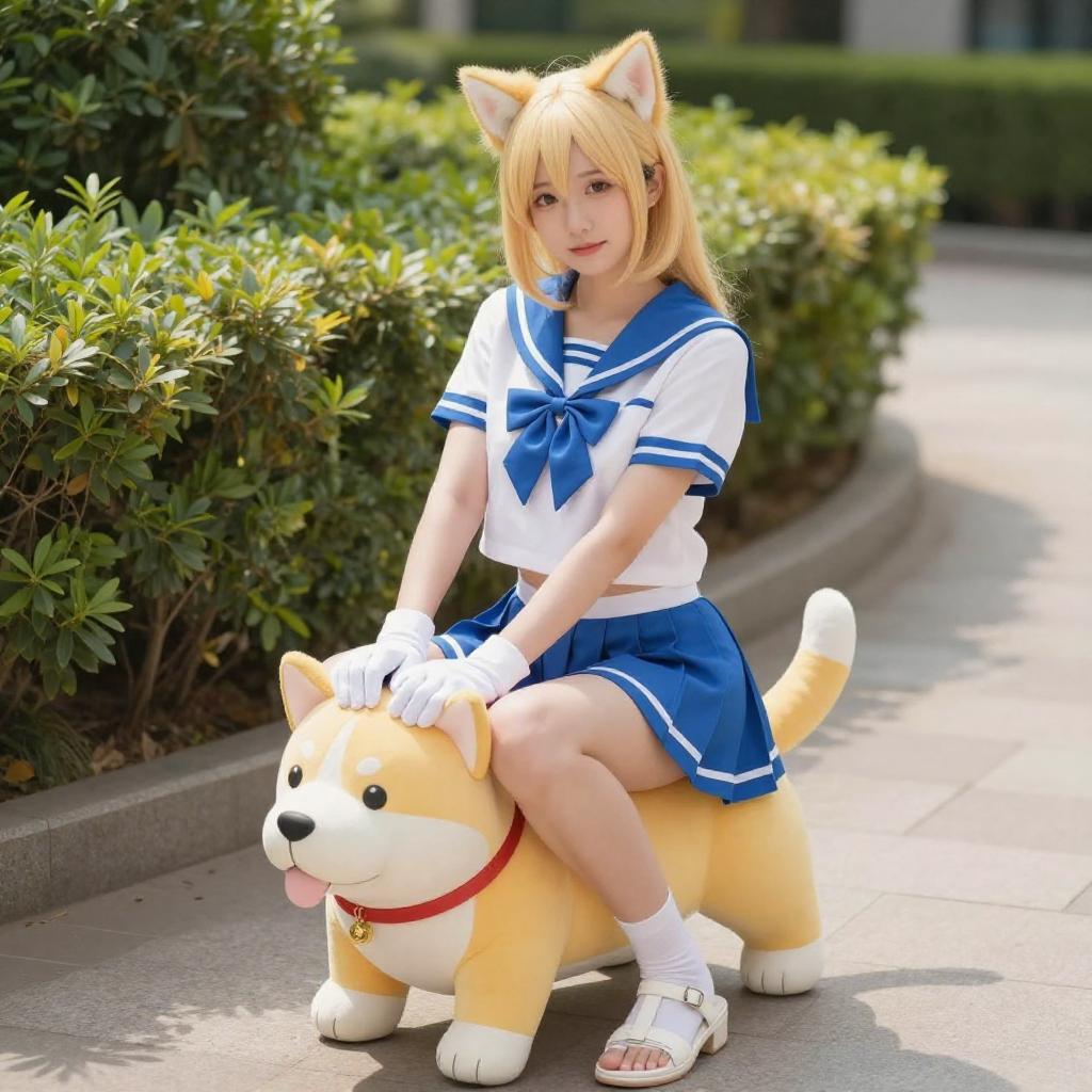 Photograph of a blonde woman in a white and blue anime-style sailor outfit with cat ears, sitting on a stone path. She holds a yellow plush toy and wears white shoes with red accents. Green bushes and a wooden pot are in the background. Bright sunlight casts shadows.
