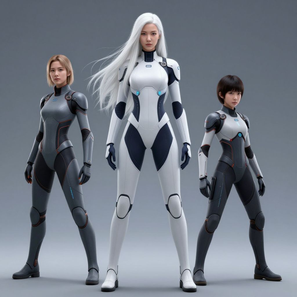 This is a CGI-rendered image of three women in futuristic, form-fitting bodysuits, standing against a gradient gray background. The woman in the center has long, flowing white hair, pale skin, and a white bodysuit with black and blue accents. She stands confidently with her hands by her sides. The woman on the left has short brown hair, fair skin, and a black bodysuit with similar blue accents. She stands with a neutral expression. The woman on the right has short black hair, pale skin, and also wears a black bodysuit with blue accents. All three women have a sleek, athletic build and are standing in a triangular formation, with the central woman slightly taller and more prominent.