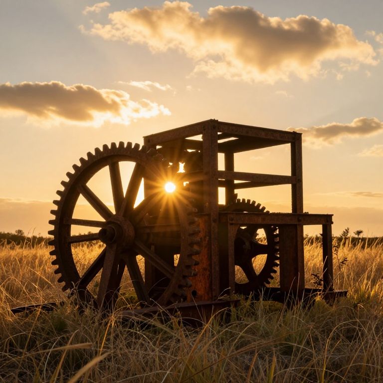 The image captures a rusted, metallic decaying structure bathed in the warm, golden hues of a setting or rising sun. The structure, composed of interlocking metal frames and gears, stands prominently in the foreground, its weathered surface etched with the marks of time and neglect. The sun, partially obscured by the structure, casts a brilliant, radiant light through the gaps, creating a dramatic interplay of light and shadow. Surrounding the structure is a field of tall, dry grasses, their tips tinged with the same golden light, adding depth and texture to the scene. The sky above is a gradient of warm oranges and yellows, with scattered clouds that reflect the sunlight, enhancing the overall sense of a golden hour. The composition is balanced, with the structure centrally positioned, drawing the viewer's eye through the scene and emphasizing the interplay between the man-made object and the natural environment.
