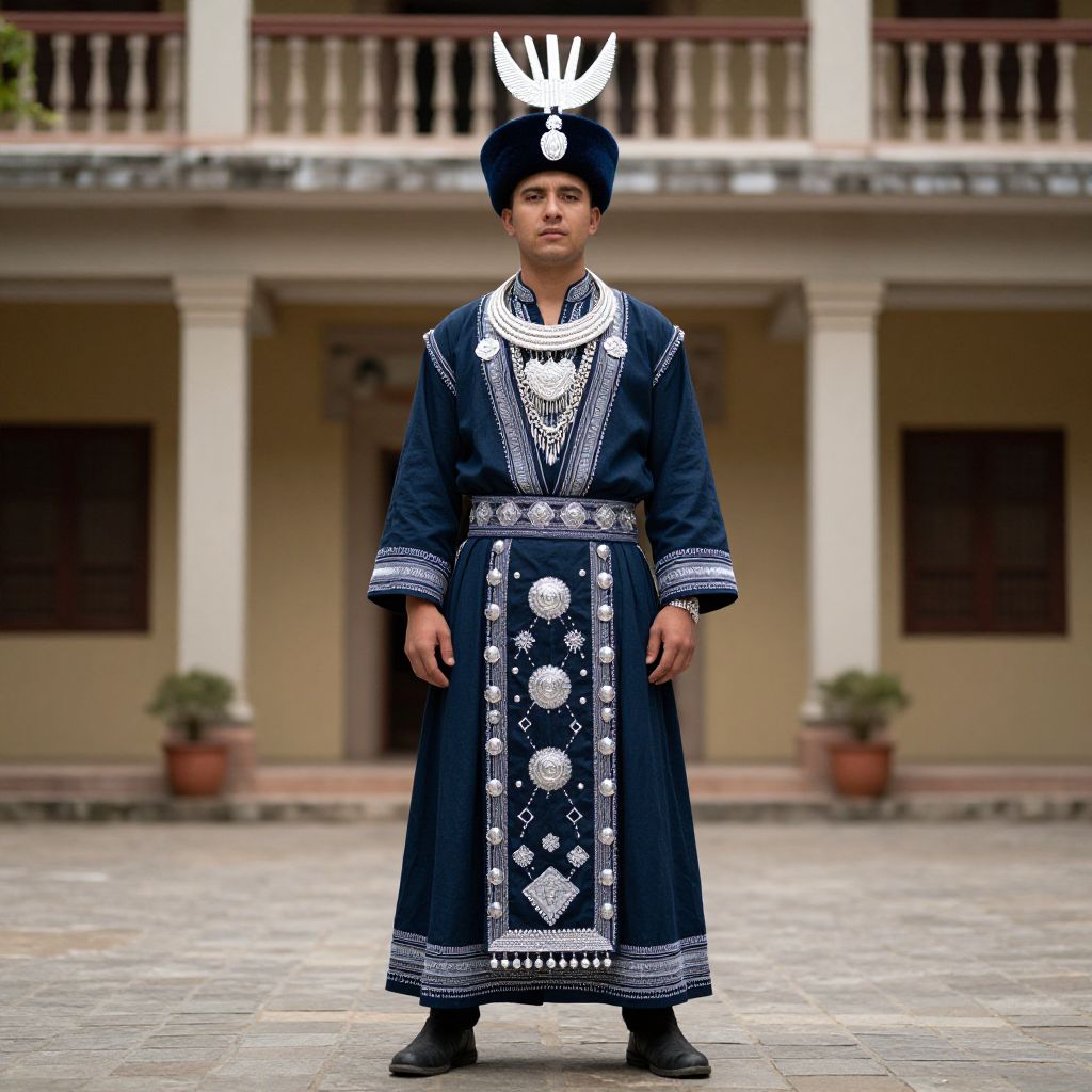 Photograph of a young boy standing in front of a colonial-style building with a balcony. He wears a traditional, dark blue, long-sleeved robe adorned with white intricate patterns and a large, central floral design on the chest. His robe is belted at the waist, and he has a matching blue cap with a white emblem at the top. The boy has a fair complexion and dark hair. His expression is neutral. The background features beige walls, two wooden doors, and potted plants on either side. The ground is paved with gray stones.