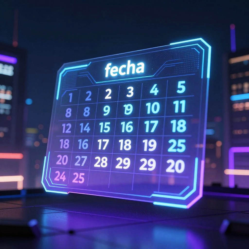 Futuristic digital interface displaying an interactive fecha (date) calendar, holographic numbers floating in midair, neon blue and purple colors, sleek cyberpunk city background at night, dynamic and glowing elements, sci-fi aesthetic.