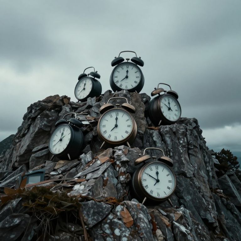 Time whispers its enigmatic secrets atop a rugged mountain of sentient clocks, their reversed rhythms echoing the melancholic dance of possibilities lost and futures untold, where serenity meets the haunting echo of what might have been.