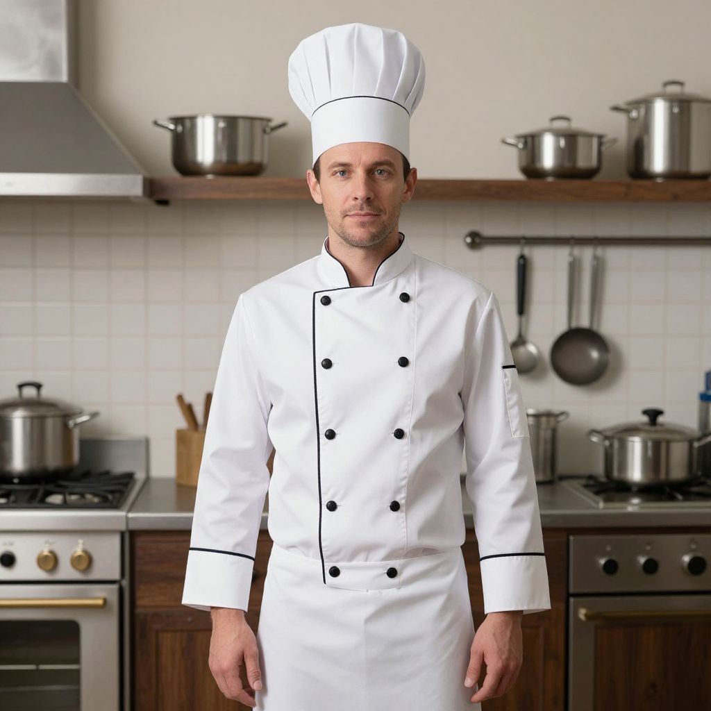 Photograph of a male chef in a white double-breasted uniform, tall chef hat, standing in a modern kitchen with stainless steel pots and wooden cabinets
