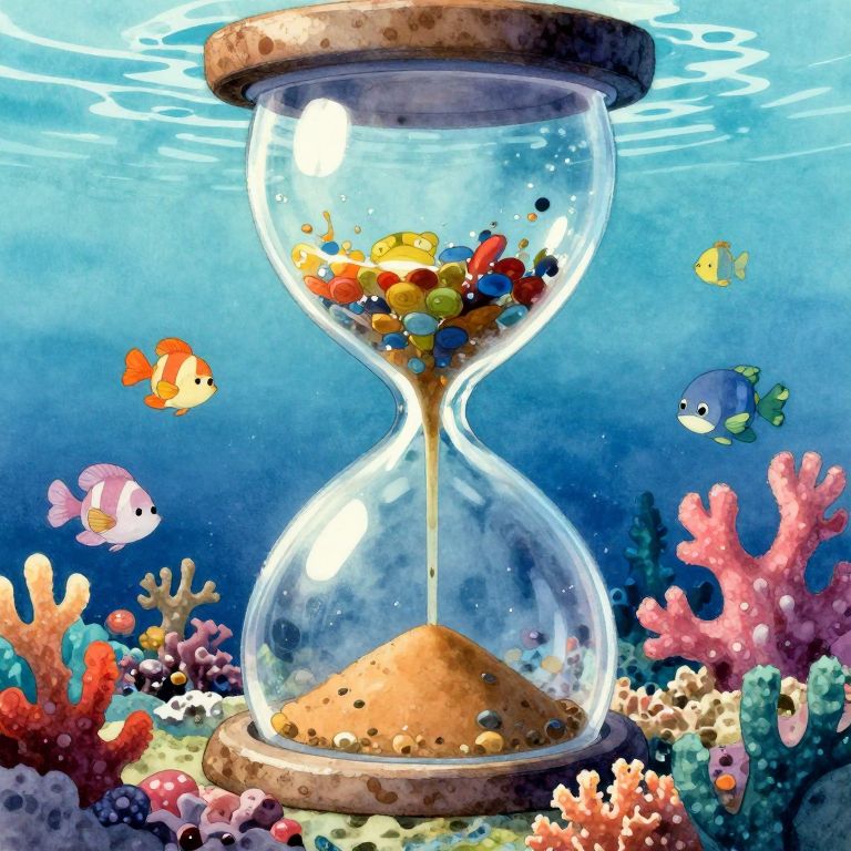 Digital artwork of an underwater hourglass with sand flowing, surrounded by colorful fish, coral, and ancient mosque-like structures in a vibrant, blue-hued