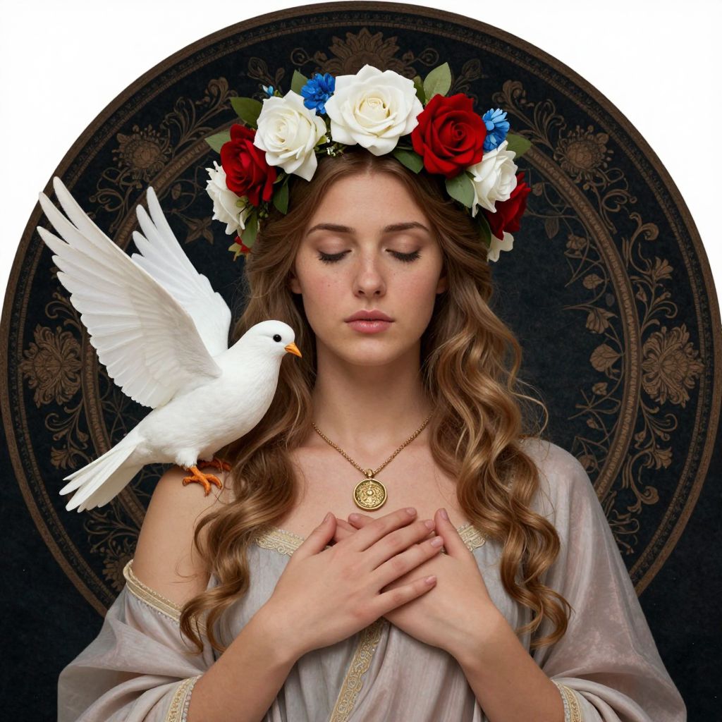 The image depicts a personification of benevolence, peace, love, and self-protection, set against a dark, circular background adorned with intricate patterns and floral motifs. The central figure, a woman with long, wavy hair, is adorned with a floral crown featuring red, white, and blue roses, symbolizing love, purity, and royalty. She wears a necklace with a circular pendant, possibly representing unity or protection. A white dove, a symbol of peace, is perched on her shoulder, further emphasizing the theme of harmony and goodwill. The woman's hands are gently placed on her chest, suggesting a sense of self-protection and care. The overall composition, with its harmonious color palette and symbolic elements, creates a serene and protective atmosphere.