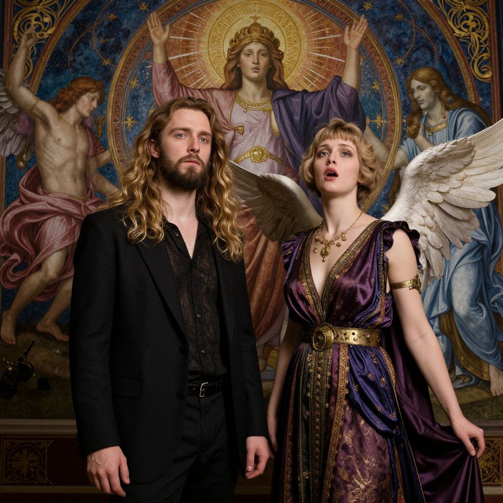 The image depicts a young man with long wavy blonde hair and a dark beard standing next to a beautiful woman with short hair. They are surrounded by a sense of wealth and opulence, yet there is a subtle decay that permeates the scene. The background features intricate, symbolic elements with a powerful occult and spiritual presence guiding them toward a higher art. The man and woman are portrayed as true artists, making angelic but tragic music. The scene is not up close, allowing for a wide view of the background and set elements, which add to the overall composition. The interplay of colors, textures, and shapes creates a rich and complex visual experience, reflecting the dynamic and multifaceted nature of the subjects.