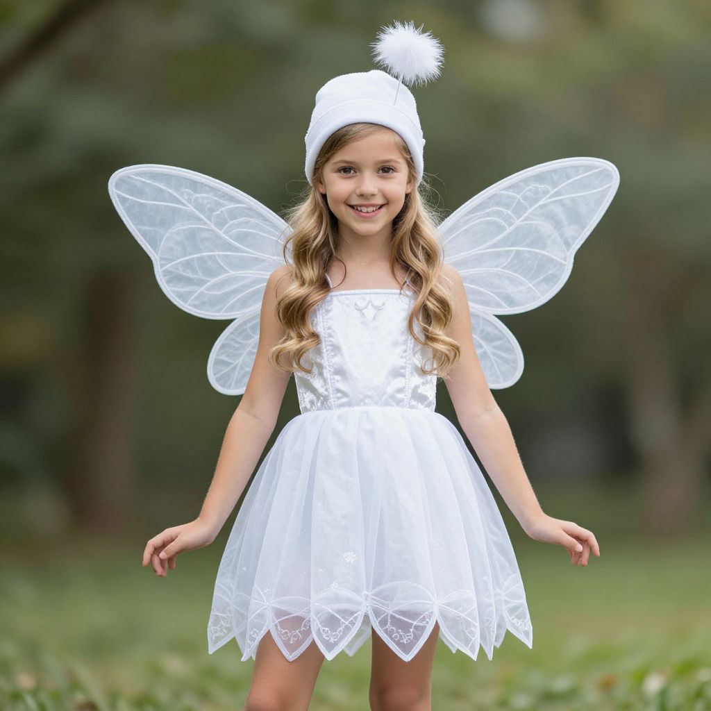 Photograph of a young girl with long, wavy brown hair, standing outdoors in a grassy, green wooded area. She wears a white, sleeveless, lace-trimmed fairy dress, white translucent wings, and a white hat with a fluffy pom-pom on top. She smiles brightly, with her arms slightly bent at her sides. The background is blurred, emphasizing her as the focal point. The overall image has a whimsical, fairy-like theme with bright, natural lighting enhancing the white costume.