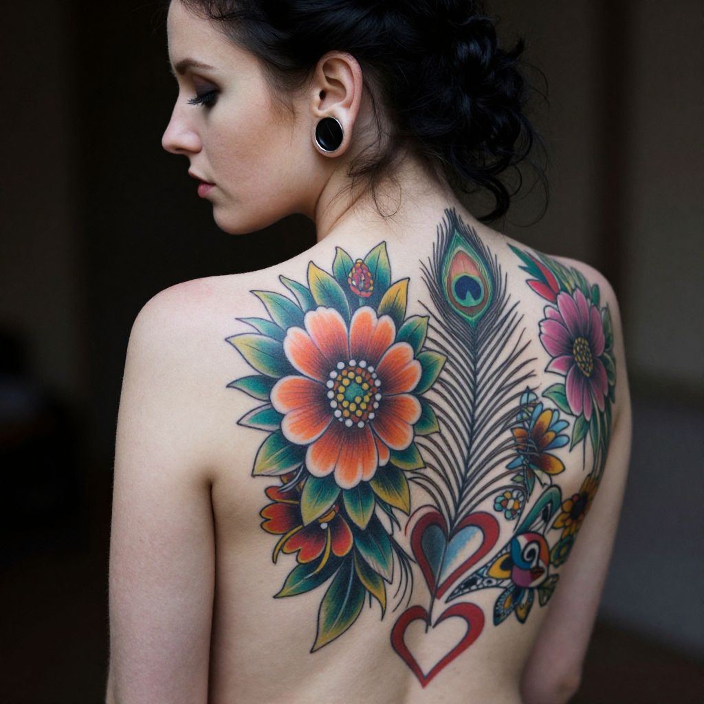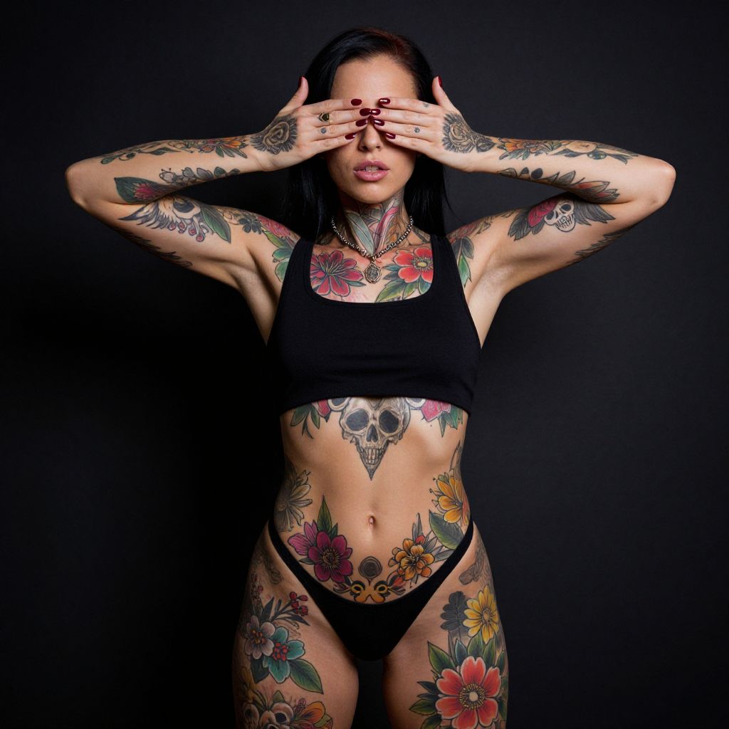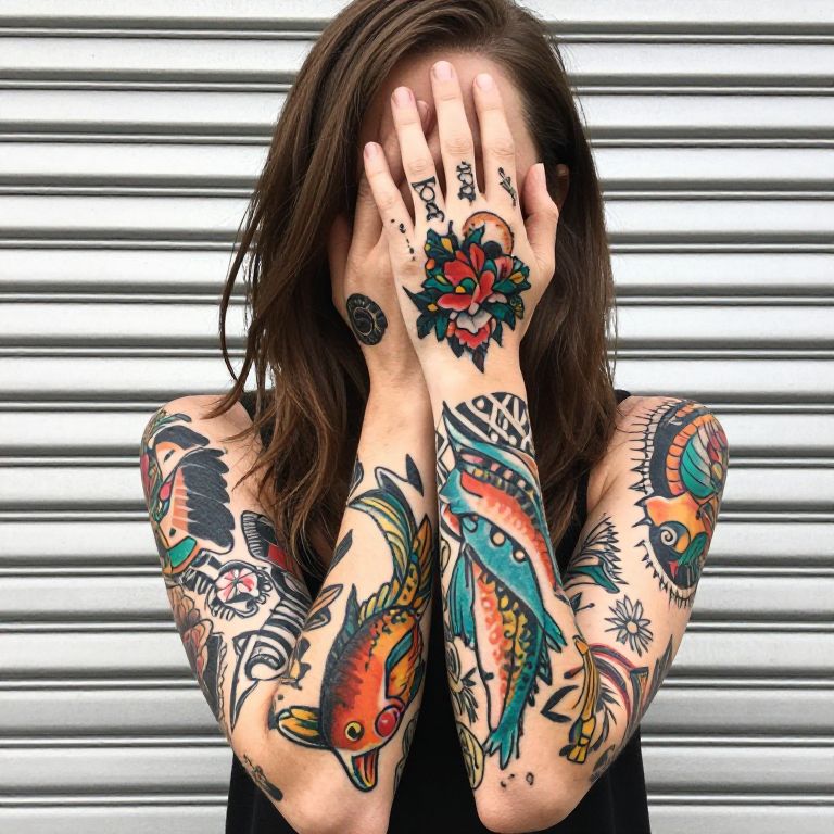 Photograph of a heavily tattooed person with long brown hair covering their face with one hand. They're wearing a sleeveless top, revealing detailed tattoos on their arms and torso, including colorful fish and intricate patterns. The background shows horizontal metal blinds. The tattoos are vibrant, and the image has a slightly overexposed look, emphasizing the tattoos' colors.