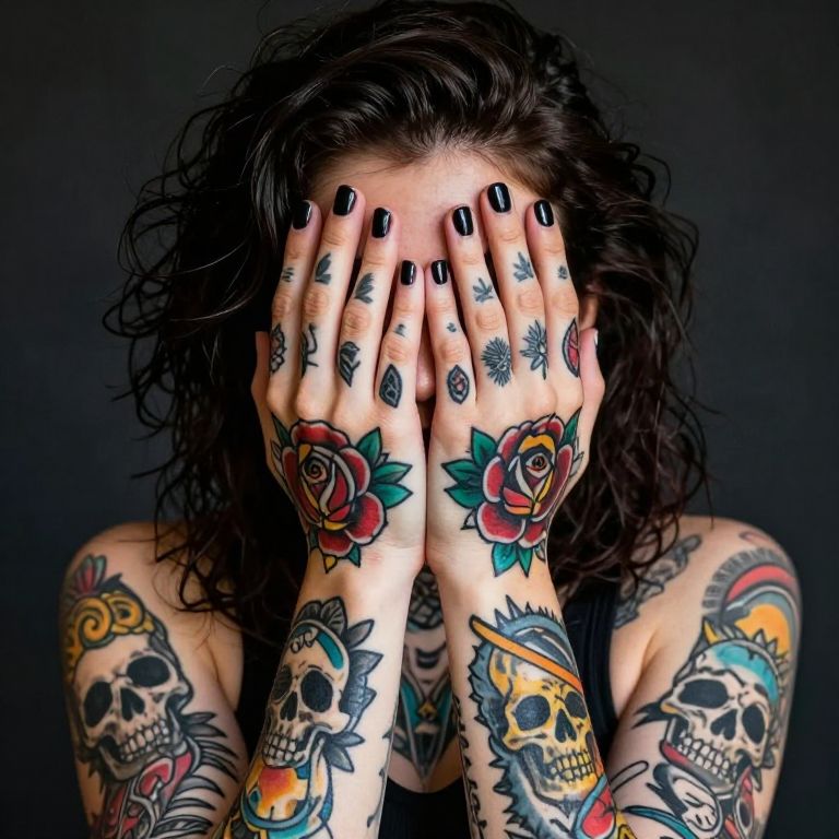 Photograph of a person with long brown hair covering their face with both hands. They have numerous colorful tattoos on their arms, including a large red and green flower on their right hand, and vibrant orange and blue koi fish on both forearms. Their left arm features a black crow and a pink flower. They wear a black sleeveless top and have a black tattoo on their left wrist. The background is a white, horizontally-striped wall. The person's nails are painted white. The image emphasizes the intricate and vibrant tattoo designs.