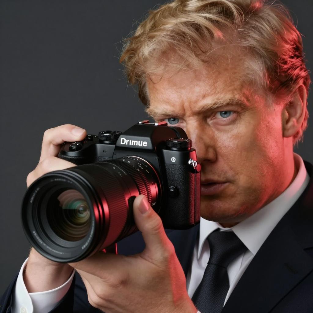 A man with short blonde hair and light skin wearing a dark green jacket is holding a large vintage camera with three lenses, covering his face. The camera is mounted on a tripod. The background features a dimly lit red room with blurred framed pictures on the wall.