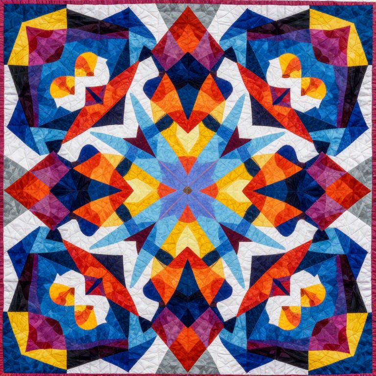 A kaleidoscopic quilt bursts with geometric magic, where abstract shapes morph into mythical faces, defying reality with their impossible symmetry and vibrant, otherworldly hues.