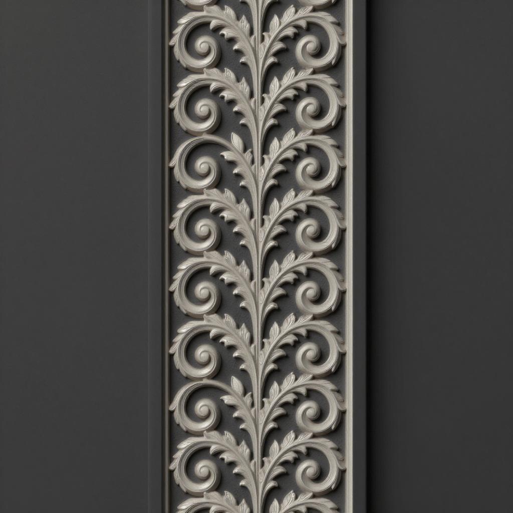 Scrollworks pattern featuring minimal neo-classical scrolls with restrained leaf forms in silver-white scrollwork on dark charcoal background arranged as vertical panel of scrolls suitable for a book spine or column on ceiling or dome decoration in an old palace rendered as highly detailed digital illustration with subtle embossing and soft shadows, ultra-detailed, sharp ornamental design, high resolution, intricate decorative pattern art