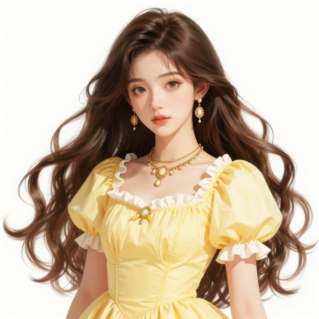 A finely detailed digital illustration of a young woman with long, flowing brown hair wearing an elegant yellow dress with puffed sleeves and white frills. She is adorned with intricate gold jewelry including earrings and a necklace. The artwork features a soft, realistic anime-inspired style with a delicate and luminous color palette, highlighting her serene expression and refined beauty against a plain white background.