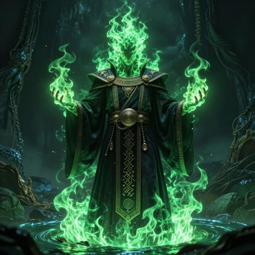 Digital artwork depicting a mysterious, faceless figure standing in a glowing, green, fiery aura. The figure wears a long, black, ornate robe with intricate gold patterns and a large circular brooch at the chest. Green flames envelop the figure's head and hands, which are raised in a commanding gesture. The background is dark and cavernous, with twisted, metallic structures and a misty, ethereal atmosphere. The figure stands in a circular pool of green, illuminated water. The image has a fantasy, magical, and otherworldly vibe.