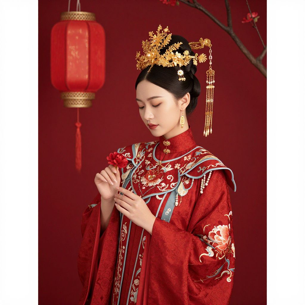 Elegantly dressed in a vibrant red traditional Chinese wedding gown adorned with intricate floral embroidery, a woman holds a small red flower while wearing an ornate golden headdress and matching earrings, set against a rich red backdrop featuring a hanging red lantern and blooming branches.