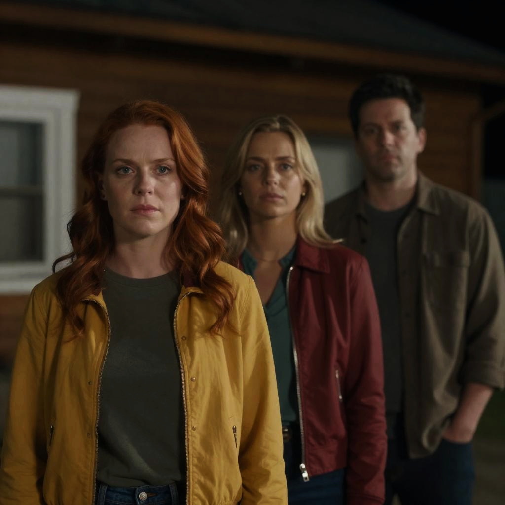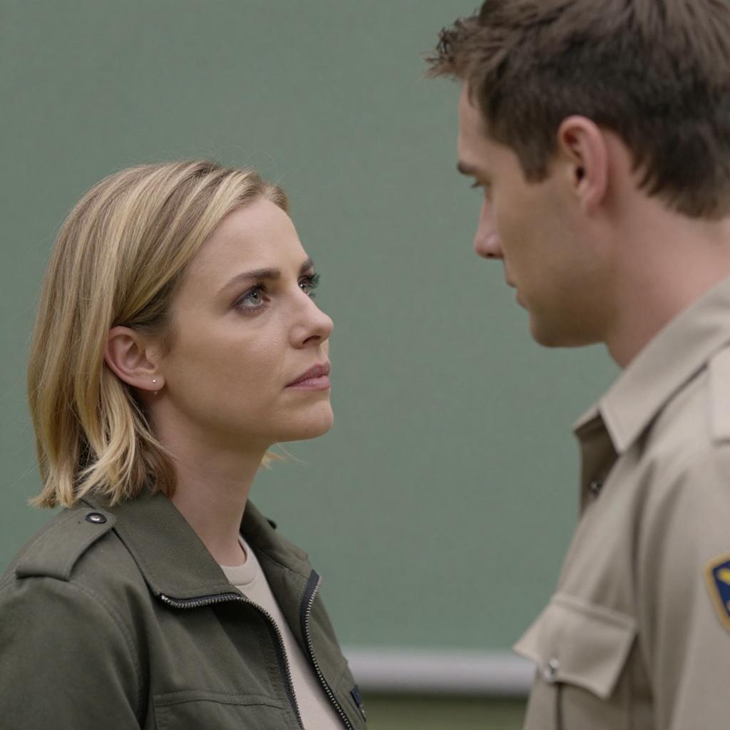 Photograph of five people standing in front of a white picket fence. Front center, blonde woman with long hair in blue tank top, neutral expression. To left, brunette woman in beige uniform, saluting, serious expression. To right, muscular man in beige uniform, stern expression, American flag patch on sleeve. Behind, bald older man in dark suit, neutral expression. Background, blurry green hill, clear sky.