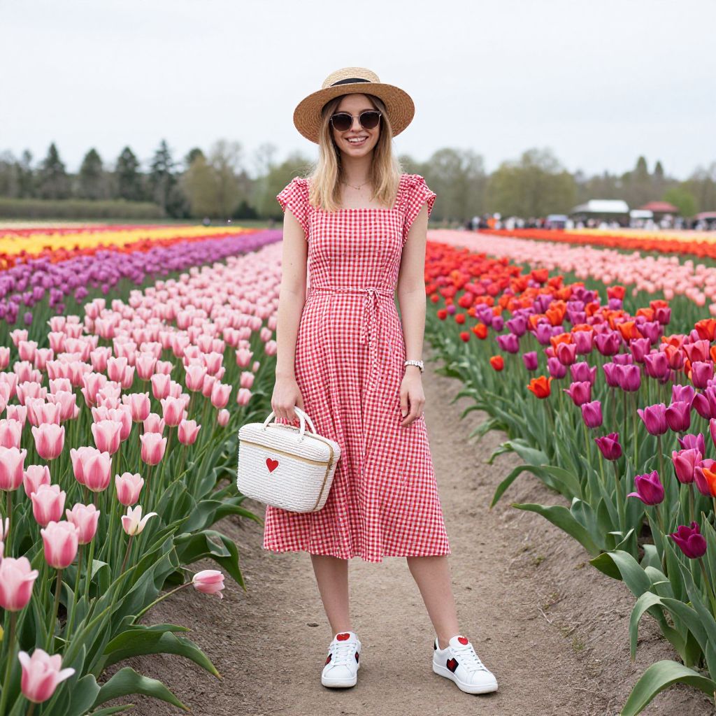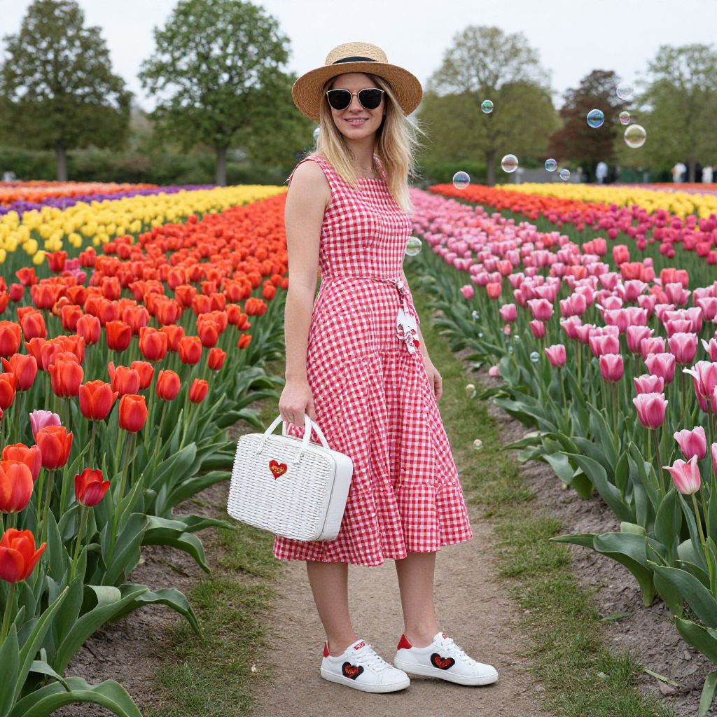 Photograph of a smiling blonde woman standing in a vibrant flower field. She wears a red and white gingham dress with short sleeves, a straw hat, dark sunglasses, and white sneakers with red hearts. She holds a white wicker basket with a red heart handle. The background is filled with rows of colorful tulips in shades of pink, red, and purple, stretching into the distance. The sky is overcast, and trees are visible in the far background. The path she stands on is sandy and lined with green tulip stems.