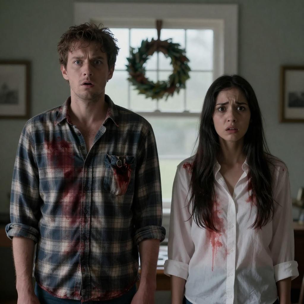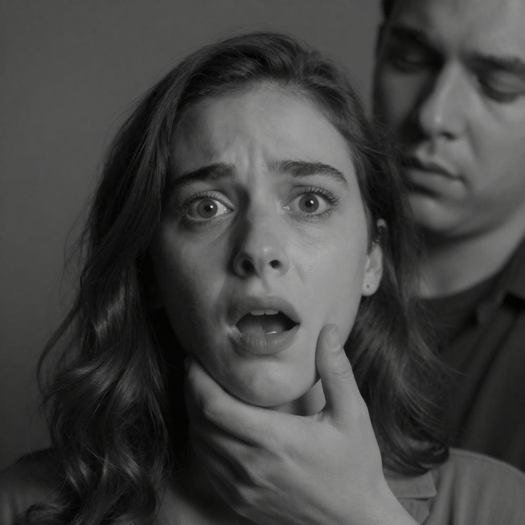 Close-up photograph of a frightened woman with clenched teeth on the left, a menacing man with wide eyes and an open mouth holding a large knife on the right. Dark, cluttered background. Man's long hair, tan jacket, blue shirt. Intense expressions.