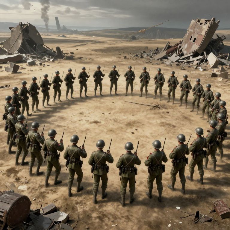 This is a high-detail, digitally rendered photograph depicting a formation of approximately twenty soldiers in World War II-era uniforms and helmets, standing in a circular arrangement on a barren, dusty battlefield. The soldiers are armed with rifles and wear olive green camouflage gear. In the background, two heavily damaged, crumpled tanks lie on the ground to the left and right, with smoke billowing from the far distance. The sky is overcast, casting a somber, grayish light over the scene. Debris and rubble are scattered across the ground, adding to the war-torn atmosphere. The soldiers' faces are not visible, emphasizing their disciplined, unified stance.