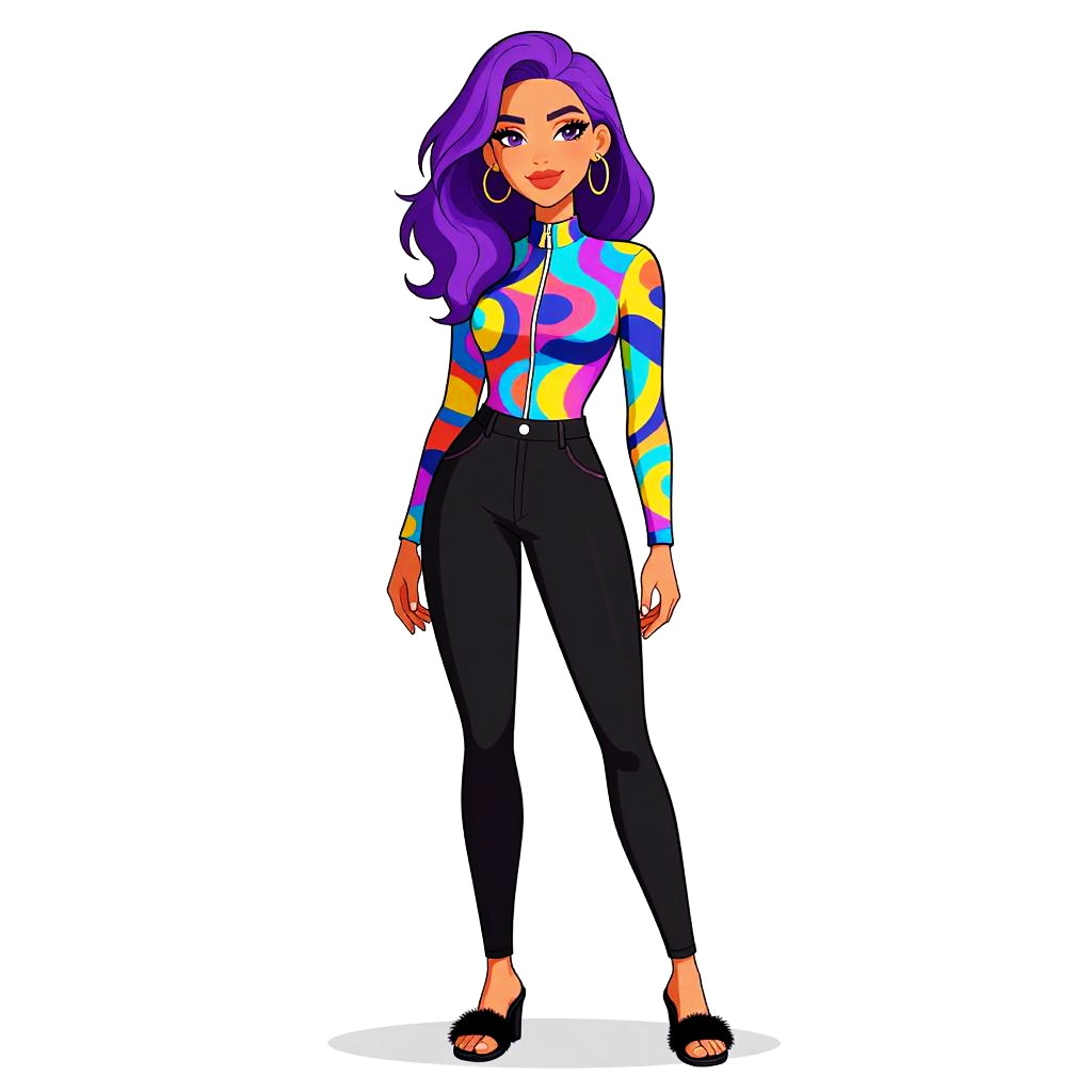 This digital illustration features a young woman with vibrant purple hair, styled in loose waves, standing against a white background. She wears a sheer, long-sleeved, brown and black zebra-print top that reveals a black bra underneath, paired with high-waisted, black flared pants. Her outfit is completed with black-and-white Vans sneakers. She has large, gold hoop earrings and a confident expression with a slight smile. Her skin tone is light, and she has well-defined eyebrows and subtle makeup. The art style is bold and colorful with clean lines and a modern, slightly cartoonish aesthetic.