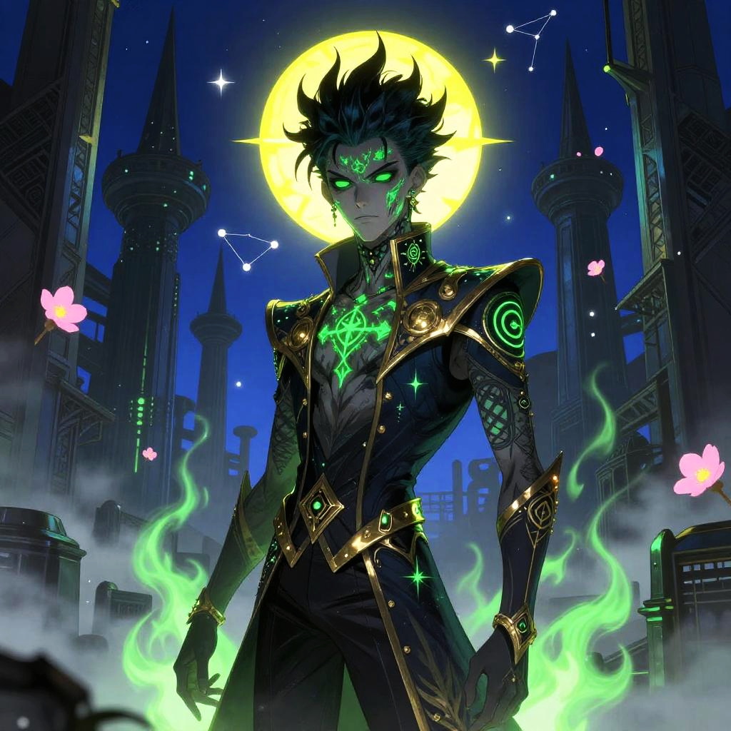 Surreal, vibrant portrait of sorin, a stoic figure with raven black spikes and glowing emerald tattooed skin, set within a labyrinth of dark steel towers shrouded in mist and flickering emerald flame. They wear an ornate dark uniform with gold accents and arcane sigils; a radiant yellow halo crowns their head as stars scatter across a cobalt sky. Pink flowers drift among constellations, luminous hues, dreamy atmosphere, gothic cyber fantasy merging sharp contrasts and complex architectural patterns.