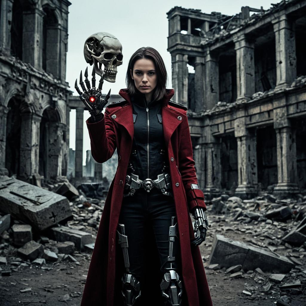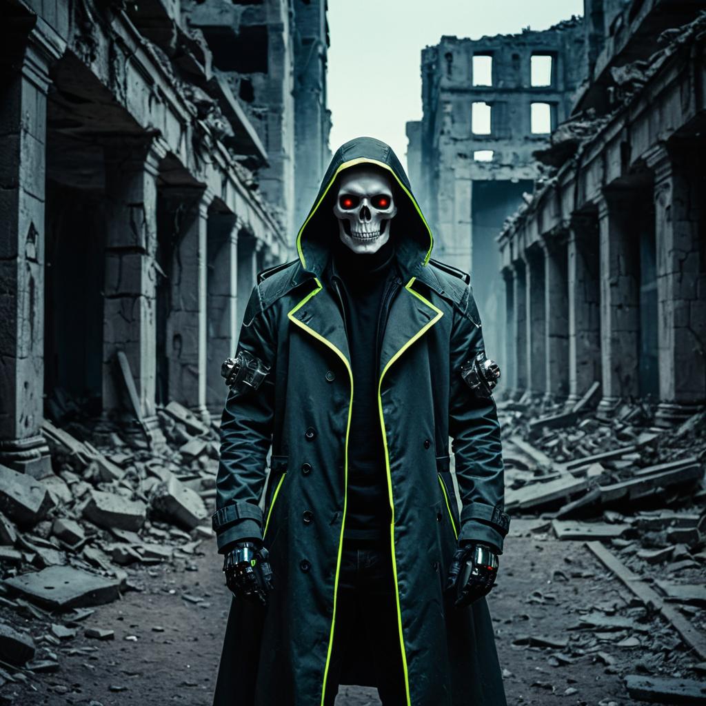 Exposure Bracketing sci-fi grimdark setting, tattooed male mercenary with cybernetic left eye and mechanical right hand, wearing a bulletproof dark gray vest, standing with a stoic expression with ruins and signs of warfare behind him