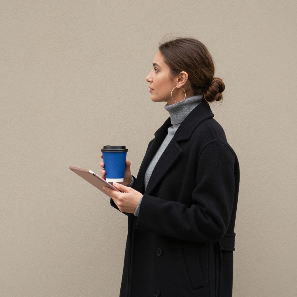 Woman with glasses and large hoop earrings, dark hair in a bun, wearing a light blue button-up shirt and beige pants, sitting on a wooden bench. She holds a white paper cup in her right hand, gray bag on her left. Textured gray wall background.