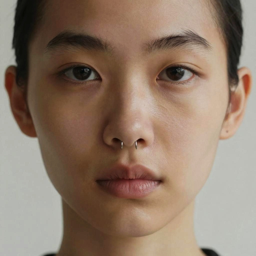 How will i look with a nose ring, close-up portrait of a person with a small silver hoop nose ring, clear skin, artistic lighting highlighting facial features, neutral background, modern and minimalist style, expressive eyes