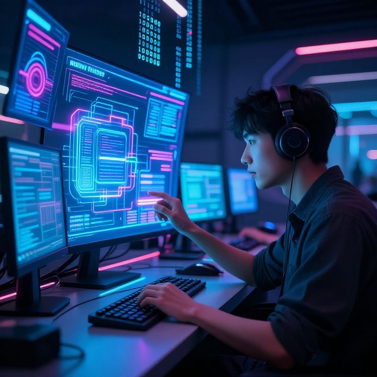 Photograph of an Asian male with short, curly black hair, wearing a dark shirt and large over-ear headphones, intensely focused on multiple neon-lit computer monitors. He's seated at a desk, right hand pointing at a screen displaying complex, glowing blue and pink circuit diagrams. The room is dimly lit with neon blue and pink lights, creating a cyberpunk atmosphere. Monitors are arranged in a row, and the background is blurred, emphasizing the subject and his high-tech workspace. The overall scene conveys a futuristic, tech-savvy environment.