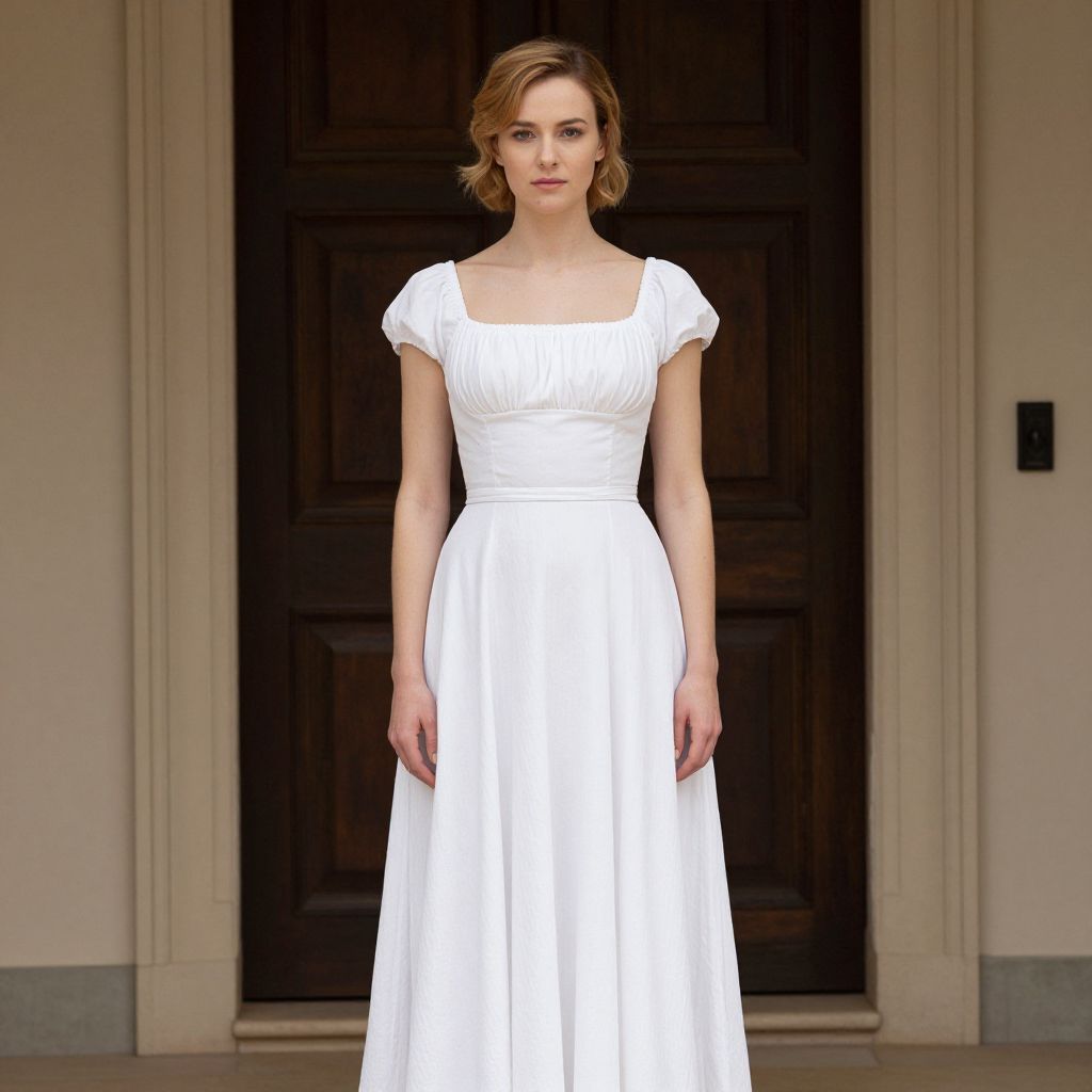 Photograph of a young woman standing in front of a dark wooden door with beige walls. She has light brown, shoulder-length, wavy hair and fair skin. She wears a white, sleeveless, A-line dress with a square neckline and subtle pleats. Her expression is neutral, and she stands with her arms relaxed by her sides. The lighting highlights the dress's smooth texture, contrasting with the dark door behind her. The image has a clean, minimalistic style with a focus on the woman and her elegant attire.