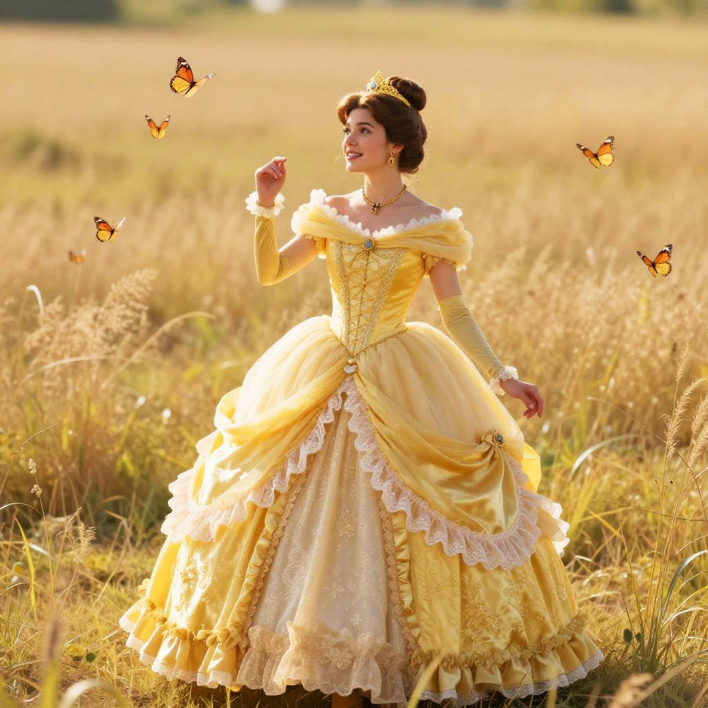 Disney princess in a bright yellow outfit, standing on a golden meadow with butterflies fluttering nearby, detailed costume with ruffles and delicate lace, radiant sunlight highlighting her noble and kind demeanor