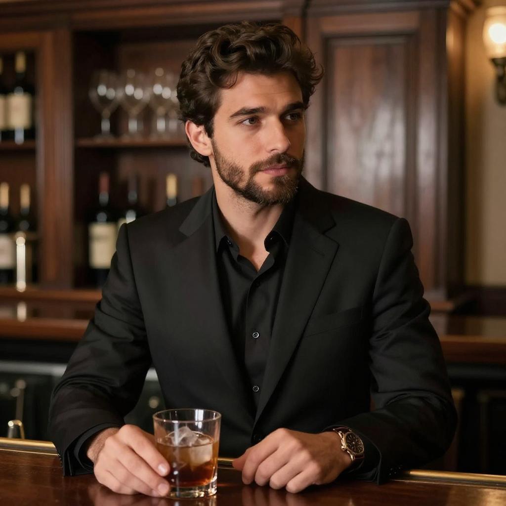 Photograph of a handsome man with short, dark brown hair and a trimmed beard, wearing a black suit and black dress shirt. He's sitting at a wooden bar counter with his hands resting on it, looking slightly to the side with a relaxed expression. In front of him is a glass with a brown liquid and ice. The background features a dark wooden cabinet with glassware. The lighting is warm and dim.
